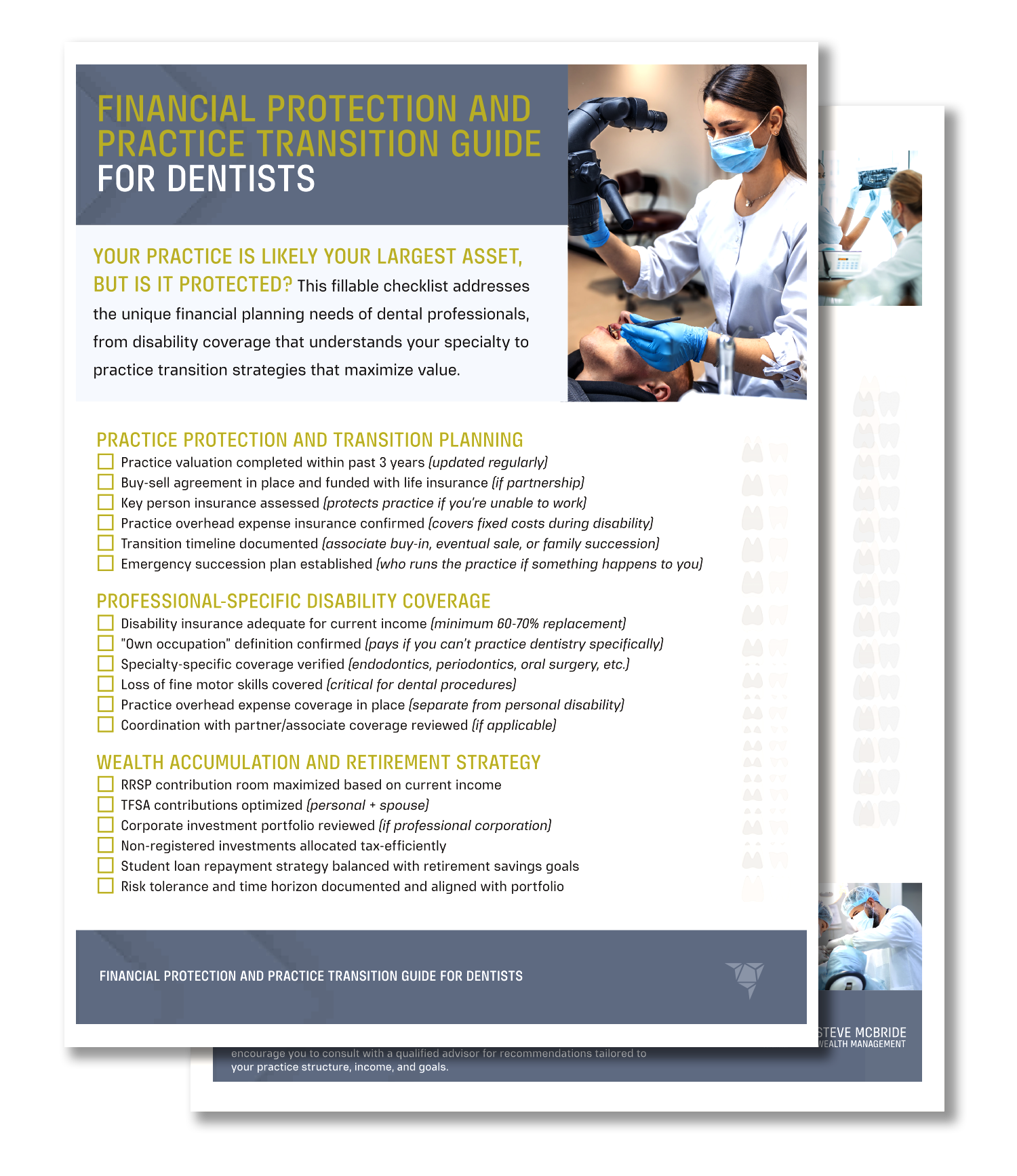 If your practice represents more than 50% of your net worth, you’re not diversified. You’re concentrated in a single asset. Strategic wealth accumulation outside your practice (RRSPs, TFSAs, non-registered investments) protects your family if practice income drops, disability strikes, or you decide to exit earlier than planned.